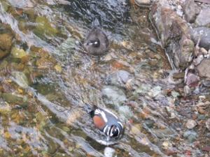 Just this past week, we’ve spotted the harlequin ducks on the creek, within a week of the time they show up every year – shortly after the sandhill crane migration has moved further north. Friends on Haida Gwaii report seeing over 200 of the ducks just offshore from Sandspit. Why some choose mountain streams and others stay on the coast is a mystery. Maybe for the same reasons some of us leave the salt chuck and head for the mountains.