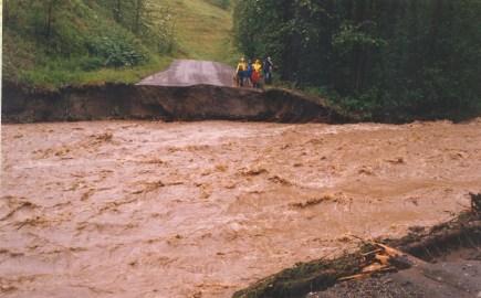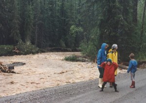 We were all astounded at the creek’s ferocity – feeling the kind of pleasurable excitement that comes with lots of drama and no immediate danger. The creek has approached that level a couple of times in the intervening thirty years, but matched that year. Huge angular boulders, rip rap, were dumped along the stream banks in Driftwood Canyon Provincial Park and along vulnerable housing sites. But the bailey bridges brought in to replace the washouts and the others weakened by the ferocity of the water and the debris it carried are still with us.