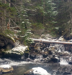 Valhalla Creek crosses the Silverking trail just above the four km marker. We were ready to get soaked in the underbrush, but the descent was dry—our boots sank into the frozen moss, the few deadfalls were easy to skirt. Just a few minutes and we were there. We stuck close to the creek until a tangle of downed trees sent us higher where Jim spotted the remnant trough of the trail outlined by the snow. We found a few blazes on the trees, but nothing clear enough to guide us when the trail lost itself in the underbrush.