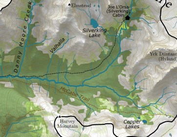 You won’t find that name on any map, but if you’ve walked along the north side of Harvey Mountain you will have seen it. It is created when a triplet of creeks—one that runs out of two little lakes on the south end of Hyland, one that runs out of Copper Lakes on the McCabe Trail and one that runs down the headwall between the two—join forces to make its way through some wet meadows to join Driftwood Creek below Silverking Basin.