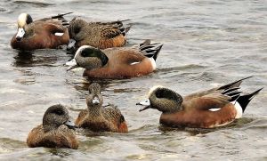 Next a big raft of buffleheads – the white males dramatic with their long black scarves flung over their backs; the females’ distinctive white cheek patches. They paddled together as if synchronized, then a quick lift of the neck and a tuck under into the neatest little dive. They were gone. A few seconds later, after gobbling some small crustaceans, they were back.
