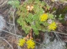 Everywhere along this part of the coast, these outcrops of rock covered with grass, moss, and lichens open to the sky; they’re wonderful spots to stop and look out, as one always does, to the ocean. The way the light sweeps into curves on tidal currents, the ducks diving, resurfacing, the loons flapping, a seal, maybe an otter, and often the bellow of sea lions. The vegetation changes – here we found one nodding onion, some (Oregon?) stonecrop, cinquefoil and even a few aspen.