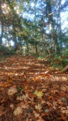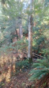 We kept this history in mind as we left Gibson’s Beach to walk the old route. Cedars, hemlock, and big leaf maple predominated – the maples’ huge leaves covered the trail. The oceanspray, another new and beautiful addition to the plants we commonly see, had shed its leaves. The trail crosses a creek that I’ve heard called Schonfield Creek, though the name doesn’t appear on any maps.