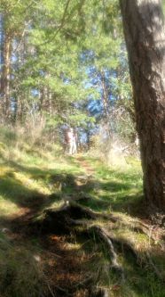 The trail climbs into long groves of arbutus and we began to see more ivy, broom, holly, and bindwood (Hedera), a strong smell signalling its presence wrapped around tree trunks and climbing the blackberry brambles.